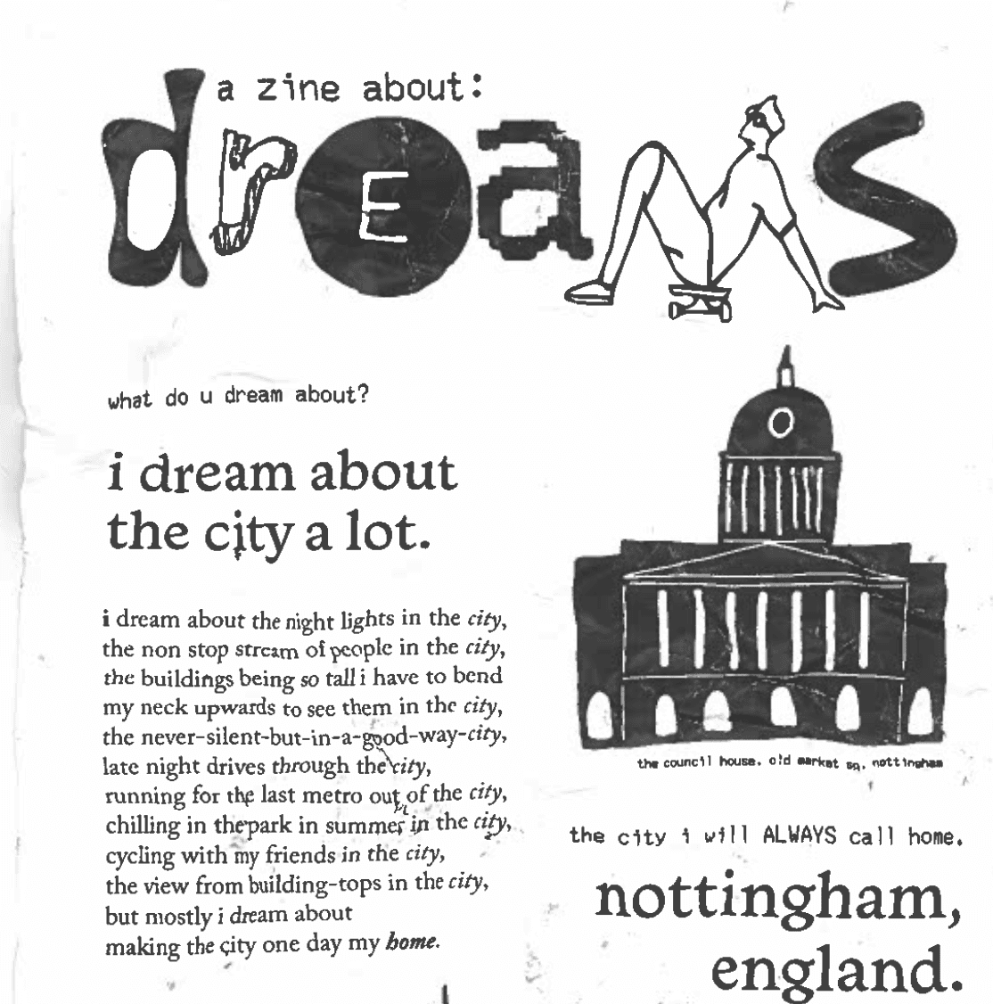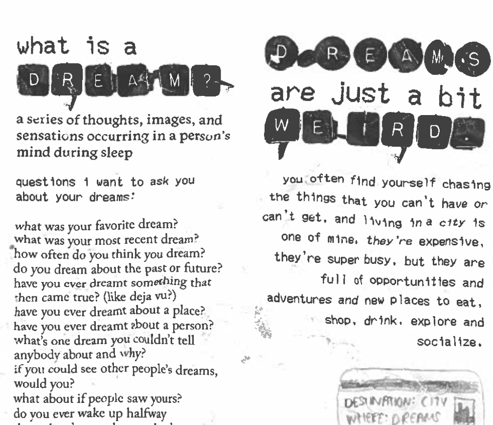 a zine about dreams was a class collaborative project. the theme "dreams" was determined by the graphic design 1 class – each of us created 1 double paged spread. this project closely related to the riso printing project – and therefore i applied the concept of cities to both with similarities between the two designs.